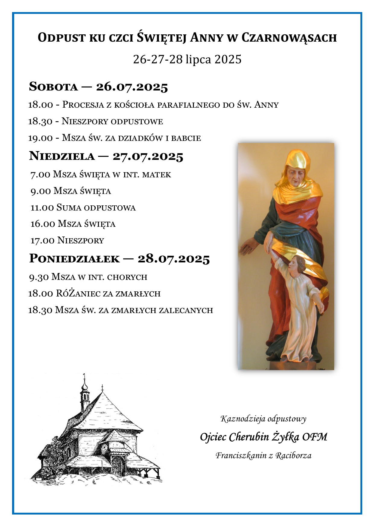 1. Dzisiaj przeżywamy uroczystość odpustową ku czci św. Anny. Serdecznie witamy Parafian i Gości. Cieszymy się z Waszej obecności na tym odpuście i życzymy Bożego błogosławieństwa przez wstawiennictwo naszej Patronki św. Anny. Zapraszamy na nieszpory odpustowe o 17.00.